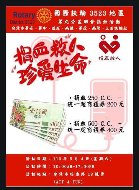 國際扶輪 3523 地區 第九分區聯合捐血活動 台北市華安、華中、益成、南德、華茂、南茂、三友扶輪社 2024年5月4日(六)捐血活動快訊: 捐血請攜帶身分證 親愛的捐血人 感謝您曾響應本社捐出熱血 再次誠摯邀請參加5月4日捐血活動 歡迎您與親朋好友一起捲起袖子 捐血送愛心! 活動時間:2024/05/04(星期六) 10:00-17:00 活動地點:松壽路18號(ATT 4 FUN ) 捐血250cc贈7-11禮券200元 捐血500cc贈7-11禮券400元 歡迎大家定期捐血,維持血液庫存量平衡 台北市三友扶輪社 https://i.imgur.com/Hbb918g.jpeg