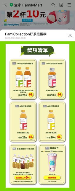 非業配,只是剛收到全家LINE的推播,純分享 HI~馬上轉轉【好茶扭蛋機】 有機會抽中FamiCollection優惠茶飲券、冰塊杯免費換!! 立即點擊 https://tinyurl.com/2em3x9rv 試試手氣吧! 獎品如下: https://i.imgur.com/zs6NTTI.jpeg