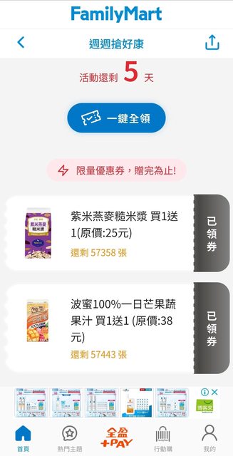 [情報] 全家週週搶好康 APP領取買一送一優惠券 紫米燕麥25元買一送一 波蜜芒果38元買一送一 -- ※ 發信站: 批踢踢實業坊(www.ptt-site.org.tw), 來自: 1.200.163.110 (臺灣) ※ 文章網址: https://www.ptt-site.org.tw/Lifeismoney/M.1714965636.A.C87