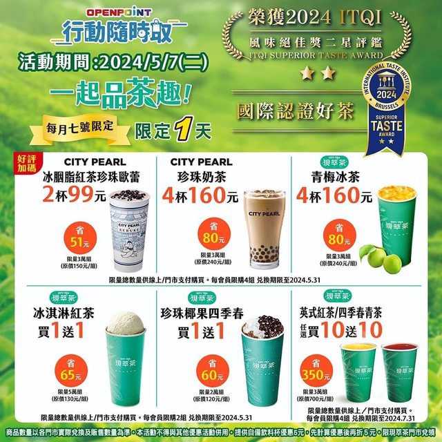 資訊來源:統一獅官方粉絲團 臉書連結:https://reurl.cc/ZeX1QMX 就是今天 每月7號 ! 現萃茶 OPENPOINT行動隨時取 一起品茶趣! 2024/5/7 限時一天優惠! 錯過就沒囉 限量及會員限購組數 活動詳情請見OPENPOINT APP說明。數量有限,售完為止 行動隨時取傳送門https://pse.is/5wj25q 現萃茶限定門市販售,點我找限定門市:https://pse.is/5wj27h 圖片優惠資訊:https://i.imgur.com/3QieHJ7.jpeg