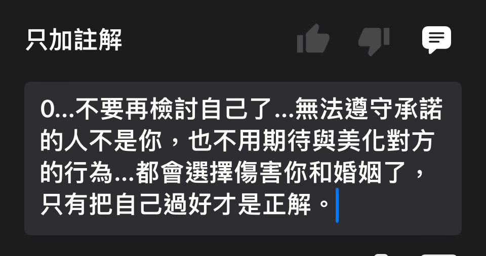 → floraiku : 差勁的不是妳,是外遇的他。不要再反覆檢討折磨自己 10/18 03:30