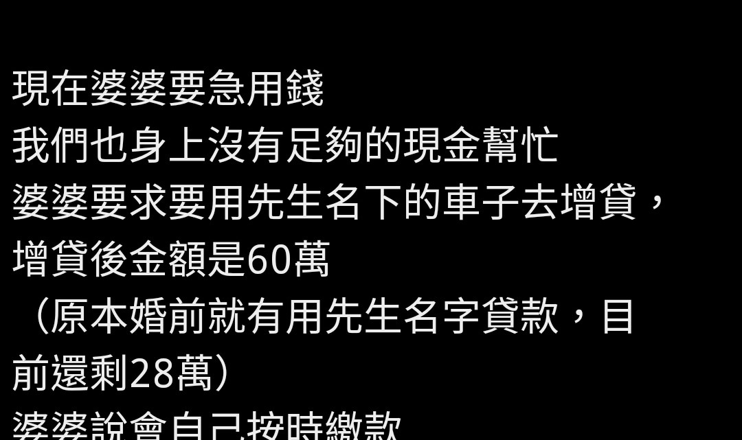 → skytowerlll : 沒人說車子是買給先生的阿~ 這裡講的是婆婆的負債阿 11/23 19:13
