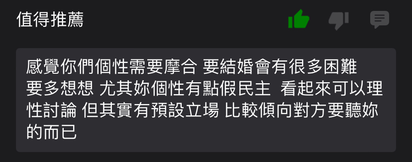 → candyrainbow: 我覺得他們是對的,一是趁登記前發現彼此不適合就12/31 09:09