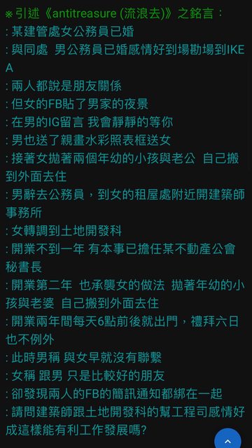 → sweetftt : 問透露女方個資,應該只是想有人把小三肉搜出來上新 01/18 17:15