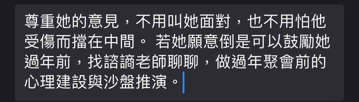 → yyc1217 : 讓她知道有可以不回去的選項 然後你也支持就好 01/19 18:16
