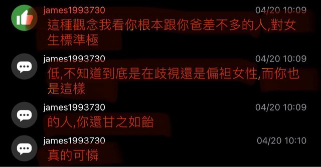→ WomanizerNo7: 我並未在文章中說我爸對女性標準低 此人惡意揣測 04/20 14:43