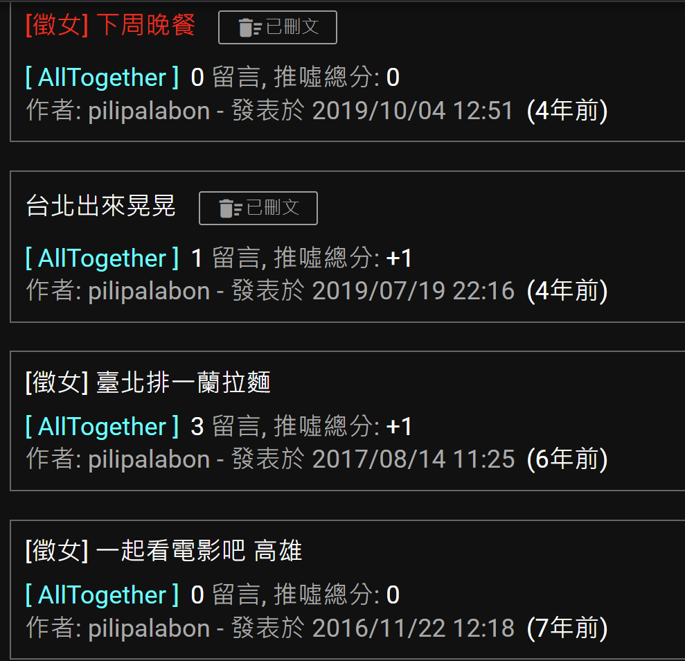→ levs : 你徵友文標題說自己大叔,預設對象是嫩妹嗎? 05/29 13:57
