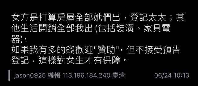 推 cynthiachen : 看來看去男方就是既得利益者 難怪太太會這麼要求自 06/25 09:07