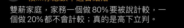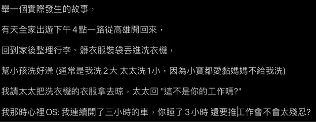 原PO:認為開車的是他,太太相對負擔較輕,所以回家後的所有家務應該由太太『代班』