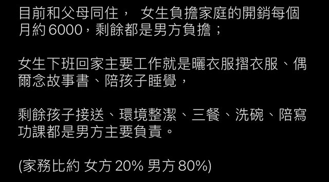家庭開銷部分,『女生』每個月提供六千,『男方』負擔『剩下』