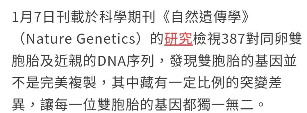 → snowtoya : 理論上同卵雙胞胎的基因就應該是完全一致,硬要拿 07/02 20:15