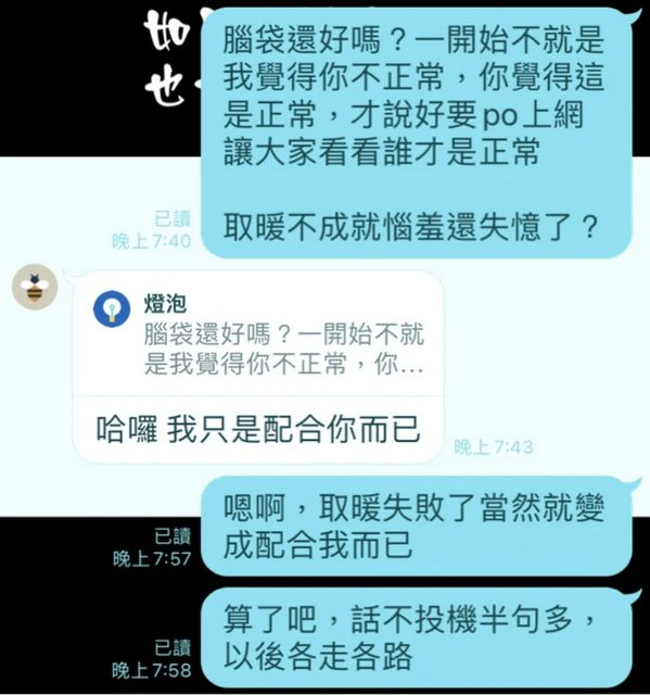 推 iampili : 看line的對話內容女方是理性的人 只是三觀不同 07/21 11:27