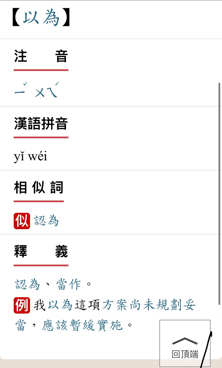 → charoo : 「以為」這詞是「當作」、「認為」。我的解釋跟一 08/02 21:43