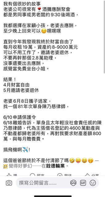 推 Js1233 : 看了原PO之前的文與底下推文,會被老婆申請保護令的08/15 11:13
