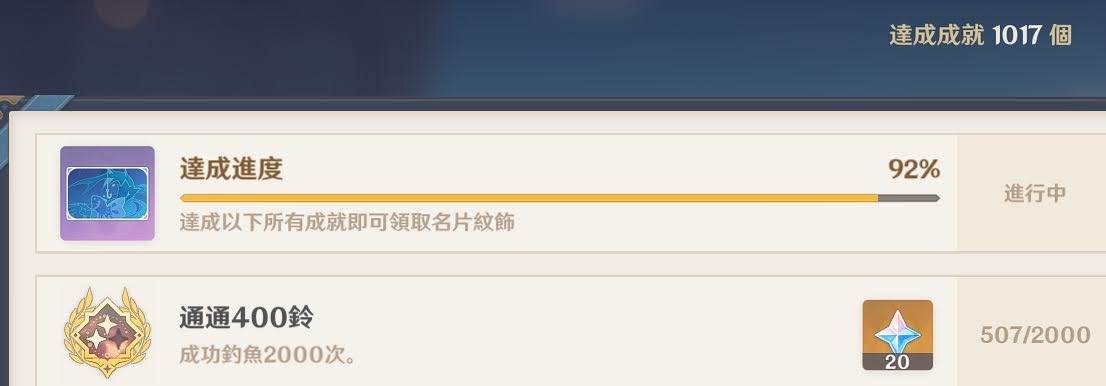 最近因為探索度滿,整個須彌到了現在也只抽了草神一隻新五星,連草貓貓都墊不出來導致 也沒角色好練,只好從原本數量有點慘的成就做起 這兩天陸陸續續補點隱藏成就到了八百九,發現七聖、釣魚跟塵歌壺第三輯真的是很硬 有在打牌的可能七聖都已經解個七七八八,但我昨天才終於升到牌手等級二,打起牌來又太 繁瑣索性先放著了 塵歌壺種菜也只能種點好採收的慢慢等,眼下比較能去做的就是釣魚了 結果上網看了一下三星成就居然要釣兩千條魚,真的是直接看傻了 釣魚可沒有什麼偷吃步跟秘訣,就是一條一條去釣,我今天下班想到就去釣一下,把蒙德璃 月稻妻的單一時區都釣過一輪也才140,真的是看到數字肝都痛起來 板上臥虎藏龍,有沒有來個1047成就,釣過兩萬條魚的來給我瞻仰一下 好解的成就都解得七七八八了,接下來要多一個都是硬仗啊= = -- ※ 發信站: 批踢踢實業坊(www.ptt-site.org.tw), 來自: 114.38.94.52 (臺灣) ※ 文章網址: https://www.ptt-site.org.tw/miHoYo/M.1694449307.A.7A8