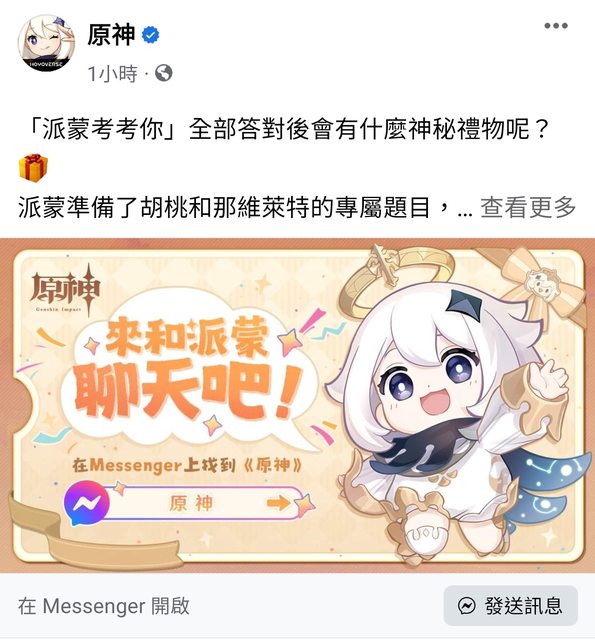 1.點擊文章下方的「發送訊息」或者點擊上方「參與連結」,進入《原神》的Messenger介