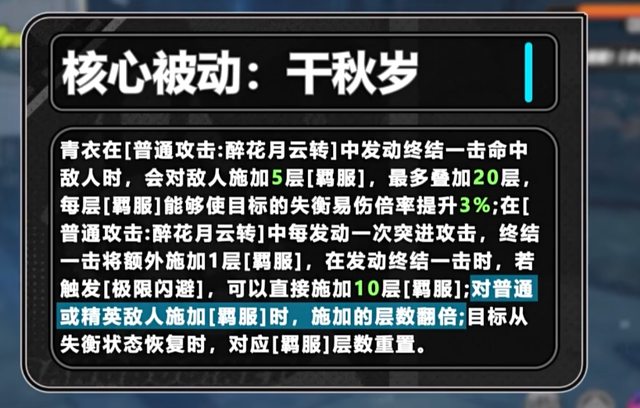 青衣可以為敵人施加失衡易傷倍率,每一層3%,極限20層共60% 終結一擊基礎是5層,而終結前的每一段衝刺攻擊命中後都會使最後終結的層數+1 所以長按馬上取消,跳過衝刺打終結 = 5層 長按後讓動作跑完,五次衝刺全命中後打出終結 = 10層 在命中一般小怪跟菁英怪時還會翻倍,所以只要完美跑完一次流程就可以掛上極限20層 那是怎樣,BOSS一拳砸下來都不能閃? 只能跑完動畫,不然就得虧層數,還要重新充電,什麼87設計? 所以還有第三種手法,長按打出『醉花月云轉』時,鬆開攻擊會立刻轉入終結一擊 但這時候,青衣自身也同時會有一段閃避判定 如果我鬆開攻擊準備打出終結時,撞上敵方攻擊,則觸發閃避判定,該次終結層數為10層 尋找空檔,衝衝衝衝衝 + 成功終結一擊 = 10層 條滿就上,衝衝衝到一半,看見出拳了,直接鬆開打出終結一擊 = 10層 大概4這樣 總結一下優點: 團隊增益只需要有強攻入隊即可,不用是電屬,不用是條子,優秀的掛件 本身賴場機制優秀,也有衝擊力轉攻擊力的面板優勢,站場久一些也不至於虧太多傷害 提供的失衡易傷為目前最高,適合朱鳶、11號這種落井下石型的主C 腿很肥 缺點: 普攻沒有推怪能力,敲木魚範圍雖大但也不能推怪,聚怪能力極差 在冰隊不如狼哥,而且現在才1.1 !!! 敲木魚一直閃,可能有人眼睛會很痛 腿很肥 --         ∕ ∕—     ◢﹍﹍﹍     ──┐ ∕▏ 日   花 ┼┼┼ ︴ ∕乛      ├—─┤ ▏╴╴   た ┼┼┼╬ ▉ ̄▏   ├──┤ ▏ 勿   ん ◢ ̄﹨﹨﹨ ▌ ̄         ┴——┘ http://youtu.be/IMcmvhcIk1g