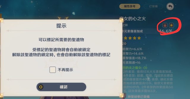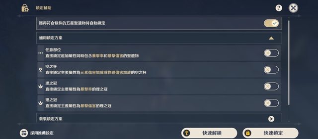 情報來源: https://hoyo.link/80GCFBAL?q=2DL44cMfgbD 聖遺物 「背包」-「聖遺物」介面,增加了按獲得時間順序預覽五星聖遺物的功能。 增加了聖遺物「標記」功能:受標記的聖遺物會同時自動鎖定,解除鎖定時也會解除標記。 「聖遺物篩選」功能中增加了「標記」狀態的篩選。 改善了「標記」、「僅鎖定」、「未鎖定」聖遺物在「背包」的排序規則。 「背包」-「聖遺物」的「鎖定功能」更名為「鎖定輔助」並調整了其介面排版。 「祝聖秘境」傳送門介面, 以及完成祝聖秘境時的獎勵領取介面增加了「鎖定輔助」功能的按鈕入口。 「鎖定輔助」功能: a.增加了「任意部位:直接鎖定追加屬性同時包含暴擊率和暴擊傷害的聖遺物」鎖定選項。 b.「套裝鎖定方案」中,可將某一追加屬性設定為「必要屬性」,標記後, 在相關套裝鎖定方案中,只有包含全部必要屬性的聖遺物方可鎖定。 c.「套裝鎖定方案」中,現在可以針對不同部位設定不同的追加屬性要求。 d.每個套裝都新增了會自動更新的「推薦方案」,可以針對不同的套裝開啟或關閉。 e.增加了「快速刪除方案」功能,可以快速刪除已設定的套裝鎖定方案。 -- 我只擷取這次更新情報聖遺物的部分, 今天開遊戲的確有看到上線新功能, 也是上次大家一直討論的除了鎖定以外的「標記」 另外還多了「智能自動鎖定」等等的功能, 突然改的太多, 低調反而做更多我覺得很意外XDD https://i.imgur.com/CE7LlEx.jpeg