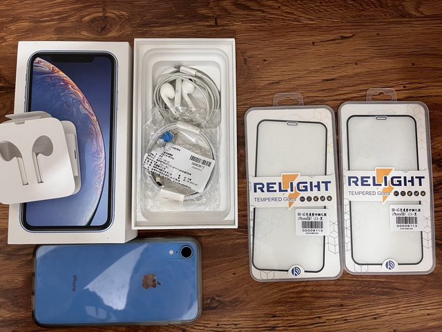 盒裝內含:原盒裝、手機、保護貼各兩張、副廠充電線,XR 多耳機