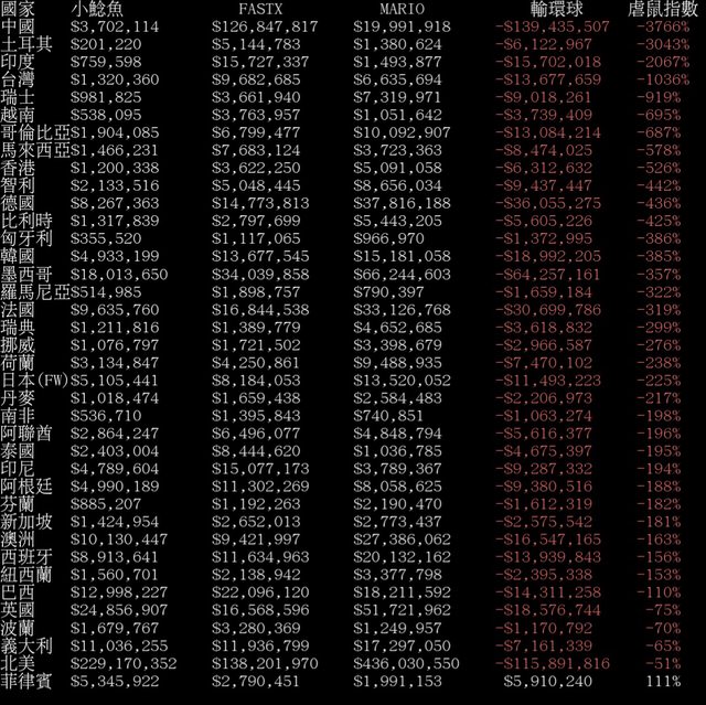 台灣 $1,320,360 $9,682,685 $6,635,694
