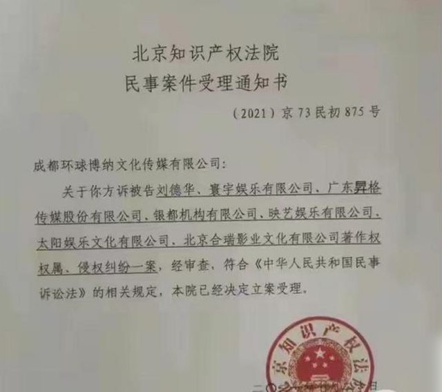 2月1日下午,該案在北京知識產權法院進行了第一次庭審,10名被告分別是:劉德華、寰