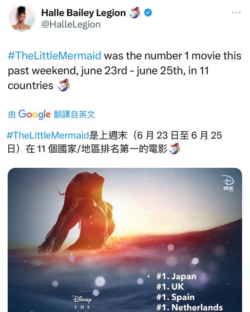 : TheLittleMermaid是上週末(6 月 23 日至 6 月 25 日)在 11 個國家/地區排名第一的