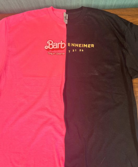 比》與《奧本海默》的「聯名」T 恤,上面大多印有瑪格羅比和席尼墨菲同框的畫面,或