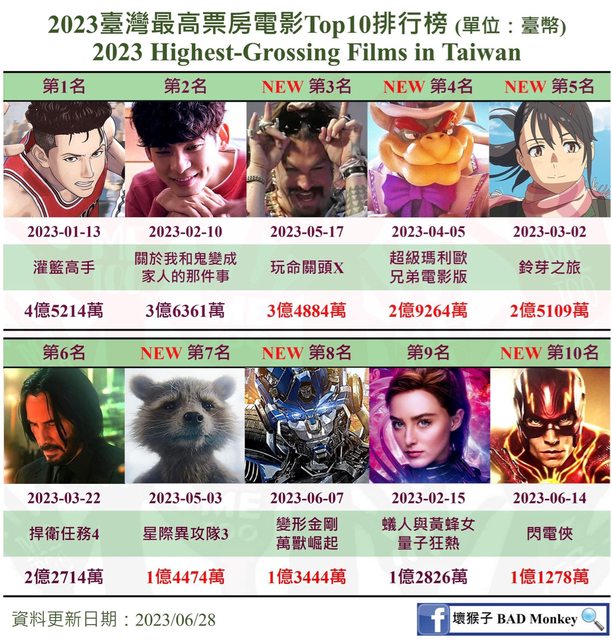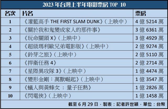 2023全台上半年票房》《灌籃高手》4.5億稱霸全台 《鬼家人》3.6億台片沒對手 2023/07/01 07:26 〔記者許世穎/專題報導〕 2023年今天正式進入下半年,台灣上半年票房冠軍是從跨年場(元旦)就一路口碑延燒, 之後稱霸春節檔的《灌籃高手THE FIRST SLAM DUNK》,不僅一洗去年春節沒有電影破億 的頹勢,更挺過上半年各路對手的挑戰,電影目前還在上映中https://i.imgur.com/PJhlm7B.jpg