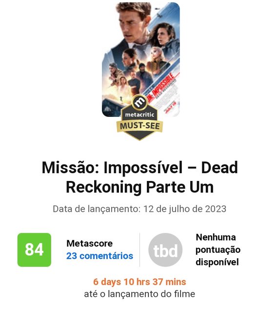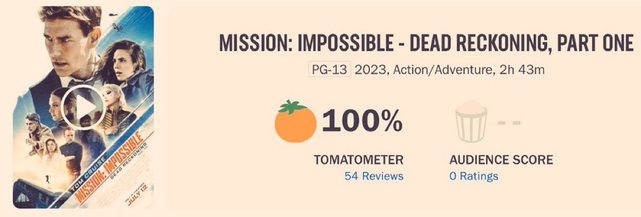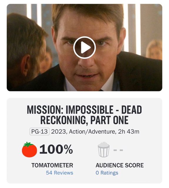 《不可能的任務:致命清算 第一章》 在爛番茄上首次亮相就獲得了100%的完美評價 https://i.imgur.com/4INx0lx.jpg