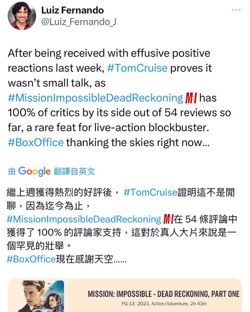 繼上週獲得熱烈的好評後, TomCruise證明這不是閒聊,因為迄今為止, Mlissionlmpossible DeadReckoning N 在 54 條評論中獲得了100% 的評論家支持, 這對於真人大片來說是一個罕見的壯舉。 https://i.imgur.com/yuZsY8A.jpg