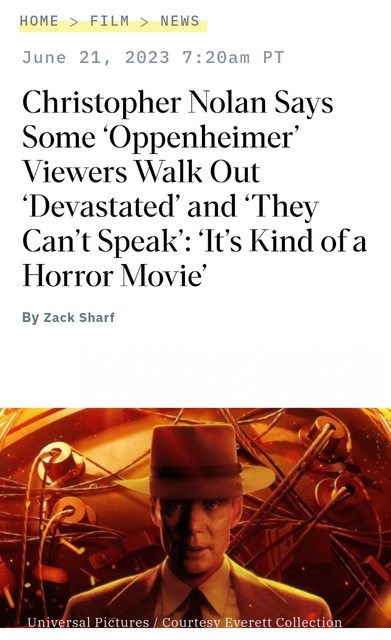 克里斯多福諾蘭最新力作《奧本海默》在法國巴黎舉行了一場世界首映,而這部長達三小 時的傳記電影也在目前公開的首波評價中獲得了許多好評,不少影評將本片形容為「壯麗 的成就」或「極為大膽」。 來自《洛杉磯時報》的編輯兼前影評人 Kenneth Turan 表示,《奧本海默》毫無疑問是 諾蘭至今最令人印象深刻的作品,同時結合了他對於視覺掌控的知識,並帶來了美國近代 電影史上最深刻的角色剖析。 以下為其他媒體發表的《奧本海默》評論 《Total Film》副主編 Matt Maytum: 「《奧本海默》令我震撼,規模最為浩大的深度角色描寫,席尼墨菲帶來了精彩的核心演 出。一部史詩級傳記電影,但同時也有著諾蘭電影顯著的特質:張力、架構、規模感、震 撼的音效設計、傑出的視覺。哇」 《美聯社》編輯 Lindsey Bahr: 「克里斯多福諾蘭的《奧本海默》是個不折不扣的壯麗成就,呈現出簡潔扼要的改編、充 滿創新的敘事,而席尼墨菲、艾蜜莉布朗、小勞勃道尼、麥特戴蒙等演員都帶來了細膩的 演出,即使只出現了一幕也是。」 《星期日泰晤士報》編輯 Jonathan Dean: 「《奧本海默》令我深深沉浸其中,一部張力十足的電影,其中一部分聚焦在原子彈,大 多數則講述我們陷入的毀滅性情境。席尼墨菲演得很好,但配角群:麥特戴蒙、小勞勃道 尼和艾登艾倫瑞克甚至帶來了一些笑料。這是一部大膽、充滿創意、複雜又能徹底震撼觀 眾的電影。」 《每日電訊報》影評 Robbie Collin: 「我感到有點不知所措,不確定應該覺得《奧本海默》充滿模糊與神秘感,還是直接了當 表示,這部電影像個令人緊張的鈽原子核一樣徹底讓我大開眼界,讓我在跑片尾名單時淚 流滿面,就如同我完全忘記了其他事情一樣。」 《Vulture》編輯 Bilge Ebiri: 「《奧本海默》真的相當不可思議。不斷出現在我腦海中的一個詞就是『敬畏』,有著一 種冷酷無情的節奏、瘋狂的細節、複雜的歷史劇,持續不斷層層堆疊,直到諾蘭以一種最 震撼且具衝擊力的方式一槌定音。」 《綜藝報》首席電影編輯 Elsa Keslassy: 「其中一個能看出法國觀眾超愛《奧本海默》的徵兆,就是他們在這部電影結束後依然繼 續待在 Le Grand Rex 戲院中,討論這部電影的內容!」 《奧本海默》也是諾蘭在離開曾共同發行《黑暗騎士》、《全面啟動》和《星際效應》 的華納兄弟後,首次環球影業合作打造的作品。 《奧本海默》將於 7 月 21 日上映。 https://news.agentm.tw/259493/ 補充:1.這禮拜還有倫敦跟紐約的首映 2.https://twitter.com/OppenheimerFilm/status/1678922933211725824 巴黎首映會,諾蘭夫婦與演員群的合照 3.首波評價吹捧,這是一定的,不管那部電影都是這樣,不過看了這些 評論,想到之前小型試映會,有人看到中離,還有一個業界人士看 完,對諾蘭說這是一部恐怖片,這些訊息結合起來 奧本海默的調性,應該是非常嚴肅深沉的 https://i.imgur.com/aDaKrbX.jpg