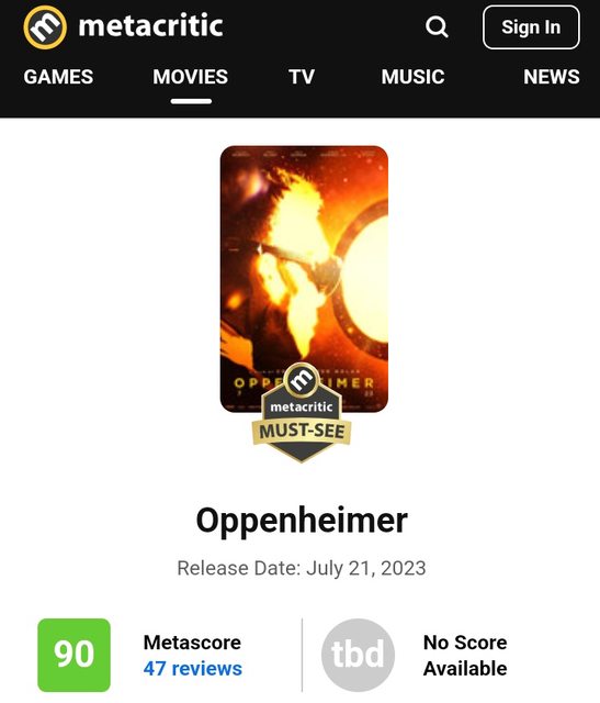 奧本海默在 Metacritic 上首次亮相,根據 7 條評論獲得了 97 分的優異成績。 https://i.imgur.com/Cyf06qn.jpg