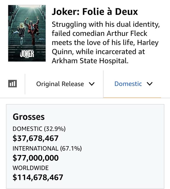 → kenkennnnnnn: 只有1.14億而已了 小丑2究竟會不會比驚奇2賠更多呢 10/08 13:56