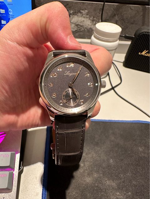 噴砂面盤很好看,搭配粉色柳葉針(個人覺得看起來偏金),搭配著草寫的Longines英文