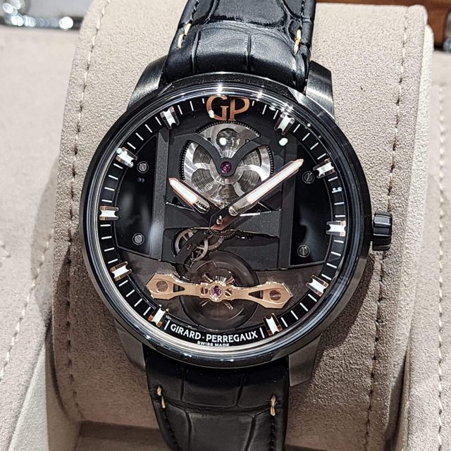 【售】: GP 芝柏 新款三橋系列 黑色縞瑪瑙箭形板橋面盤 18K金擺輪拱橋 18K金自動盤