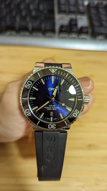 品牌名稱:Oris 手錶型號:Aquis 01733773041350742464EB 保卡年份:2017/09 隨附物件:盒單齊全 膠帶鋼帶都有 欲售金額:21000 所在地區:板橋、大台北 聯絡方式:站內信 物件描述:藍面黑圈 錶徑43.5mm、Sw200機芯、藍面,9成新日常使用痕跡,橡膠錶帶鋼帶齊全