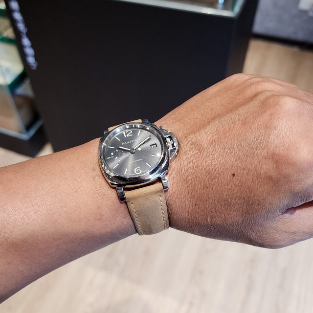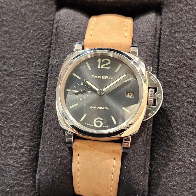 【特色】:新錶原廠訂價約21.5萬,沛納海原廠P.900自動上鍊機芯,放射灰面錶盤,時