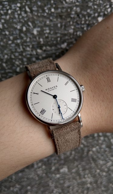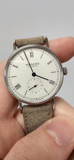 : 二手收藏品,大約8成新,有使用痕跡如圖。經典Nomos細棒棒針、羅馬數字,透明背蓋