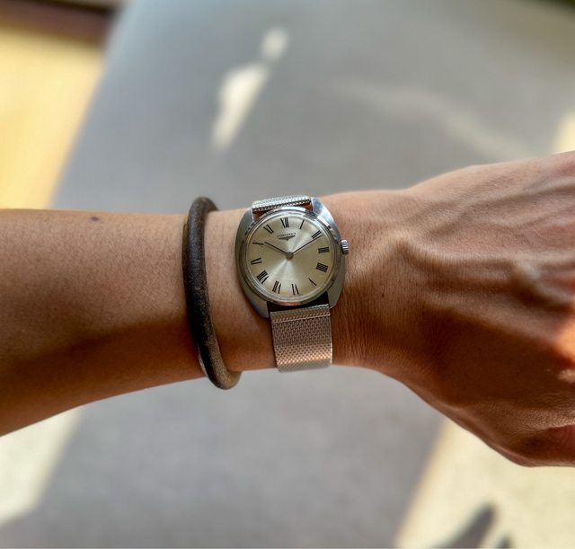 2.浪琴手上鍊老錶,約1968年生產,羅馬數字時標,無曆面盤同心圓紋路,經典428手上