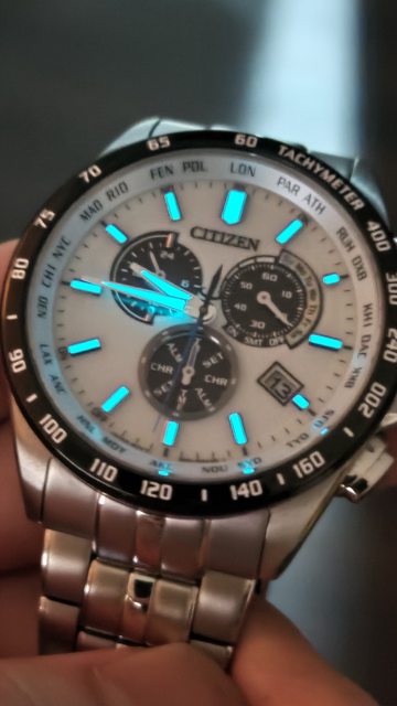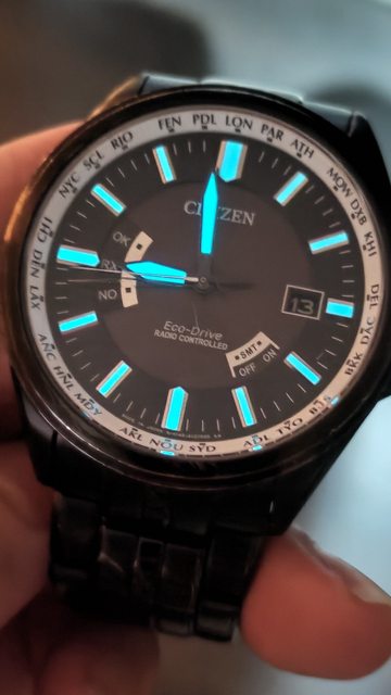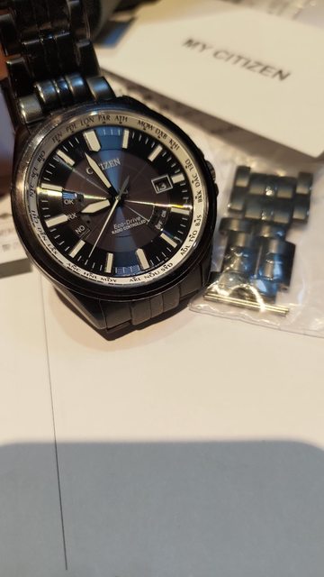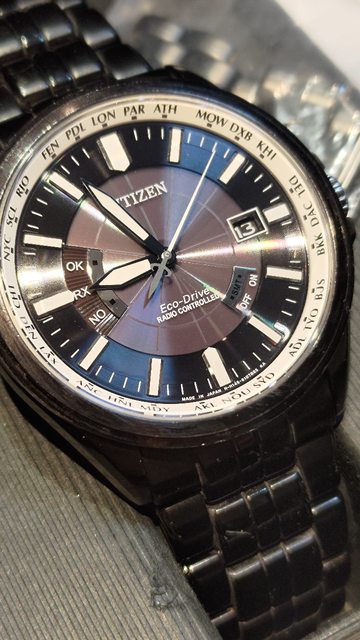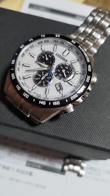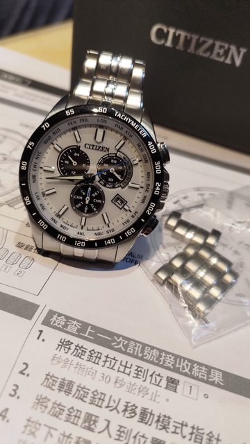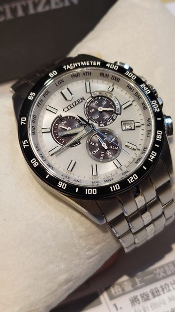 似底片的黑色放射盤,非常特別,有多餘錶節,電波對時、手動對時都正常,還有萬年曆