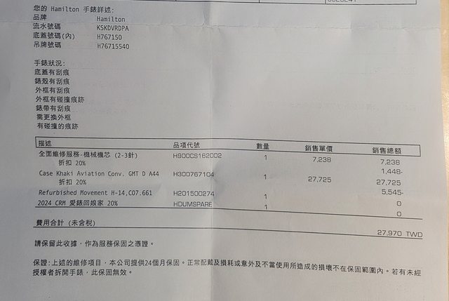 ,今年五月送回原廠更換整個錶殼含錶圈,同時進行洗油保養共NT.27970(附單據)