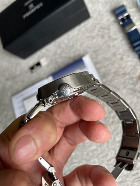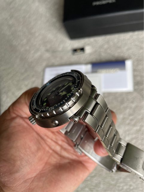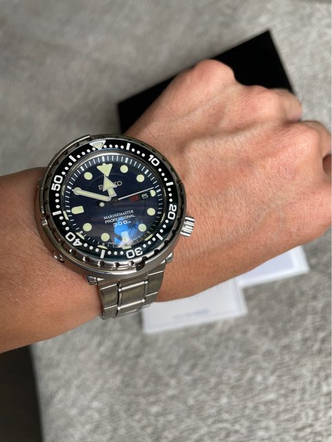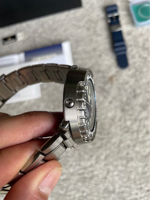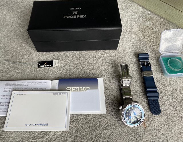 新舊狀況:正常使用痕跡,已付費更換藍寶石鏡面及更換Seiko原廠鋼帶,原廠藍色錶帶