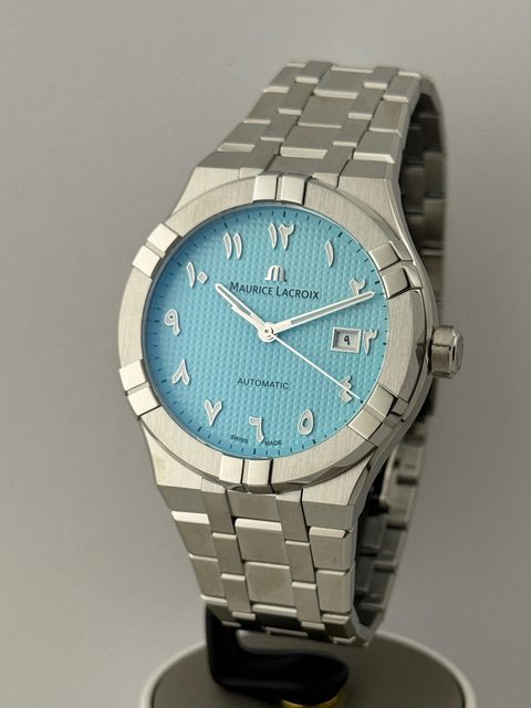 品牌名稱:Maurice Lacroix 艾美錶 手錶型號:AI6008-SS002-490-1(42mm) 購買年份:2024/8 欲售金額:45000(訂價88200) 備註:超美綠松石,配上中東面盤,限量中的限量