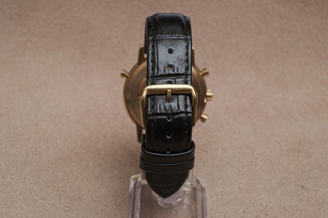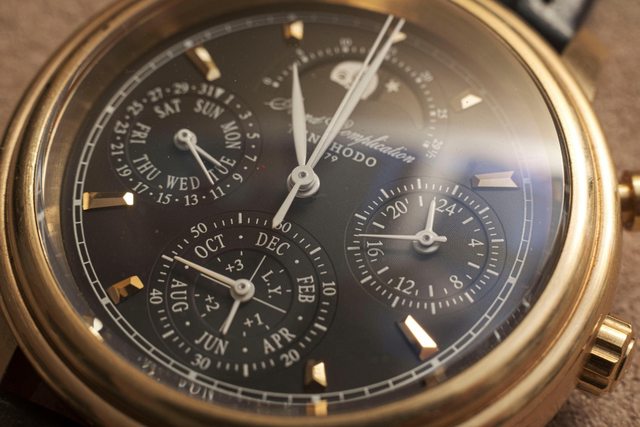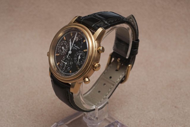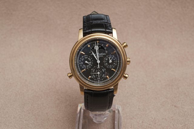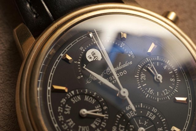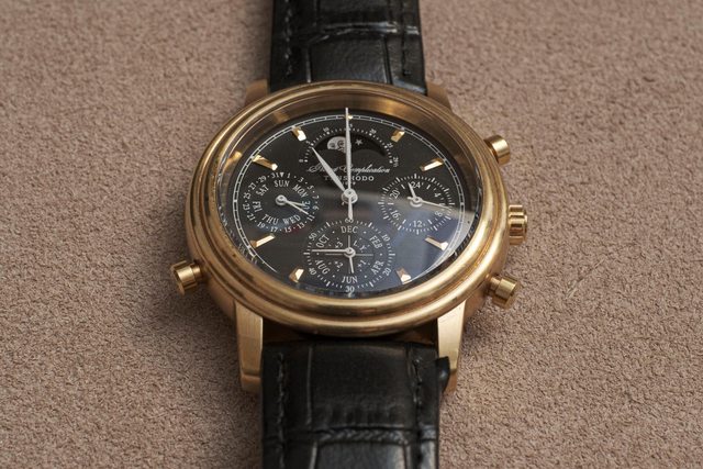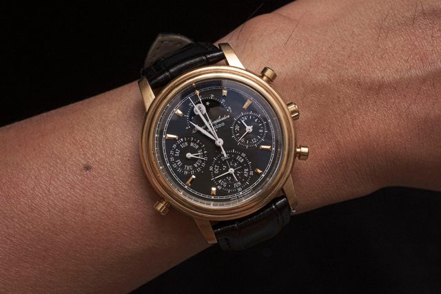 擁有複雜的石英機芯,包含四項功能:萬年曆、三問報時、計時碼錶、月相顯示。這支錶